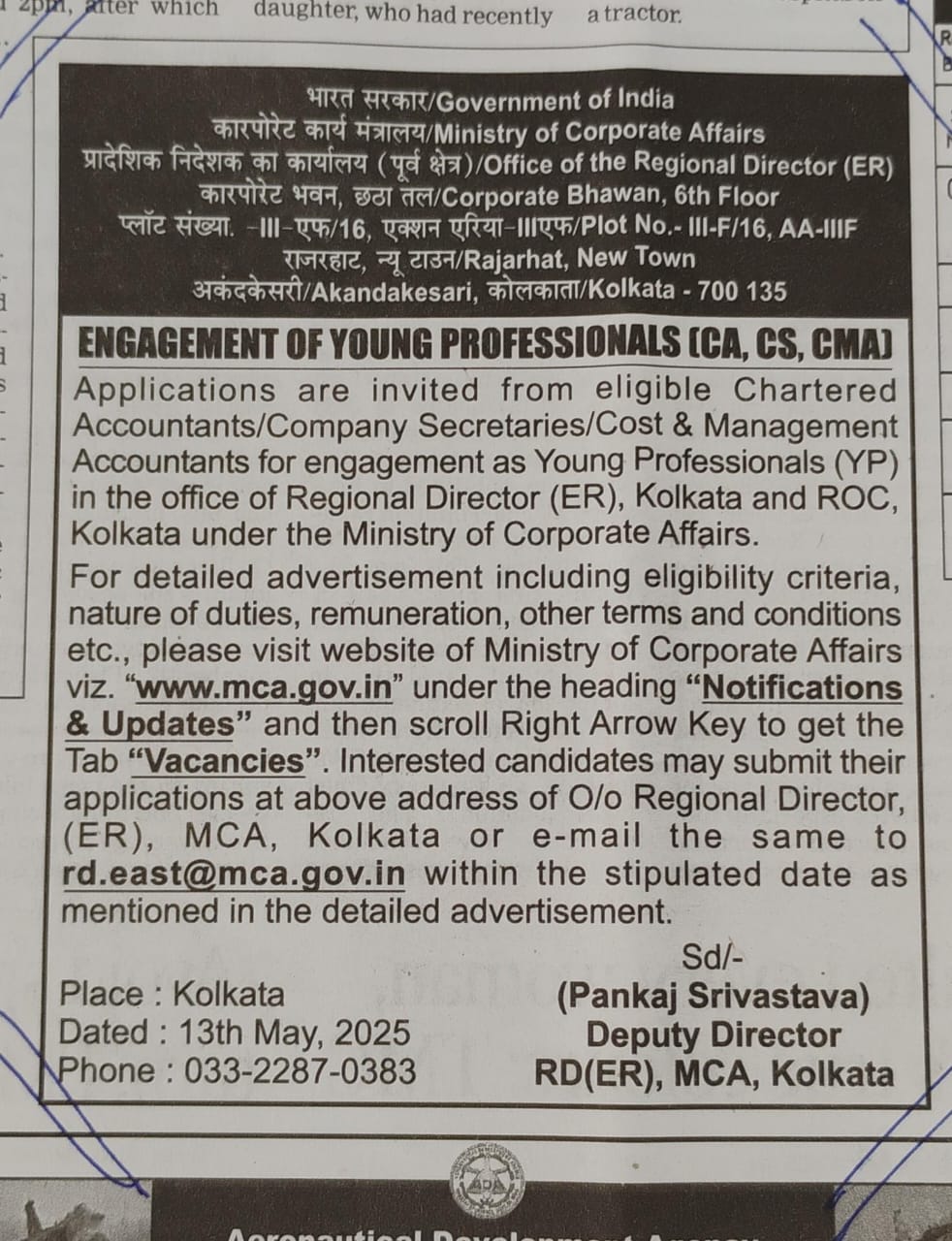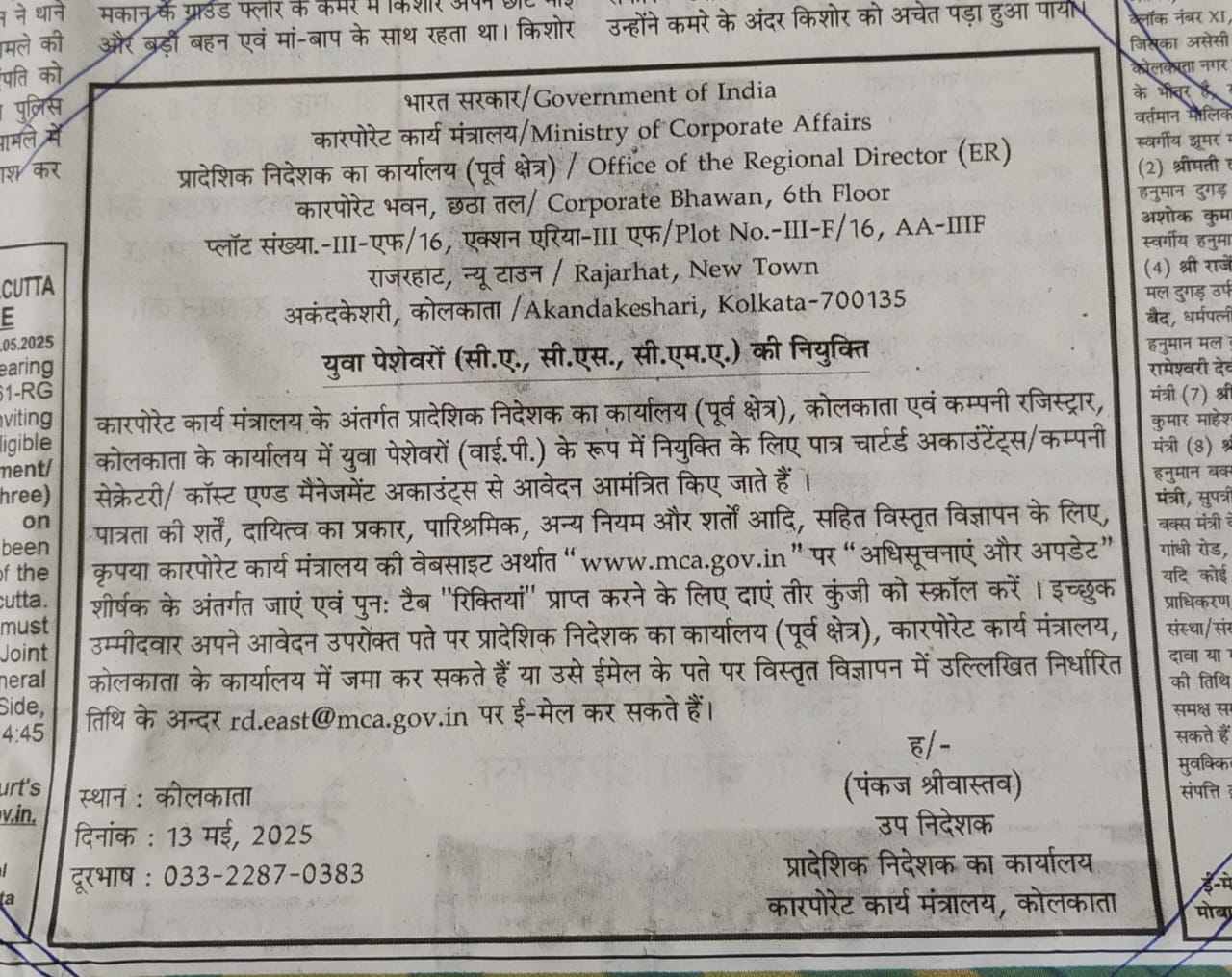 Application for the Position of Young Professional (CA/CS/CMA) at MCA, Kolkata