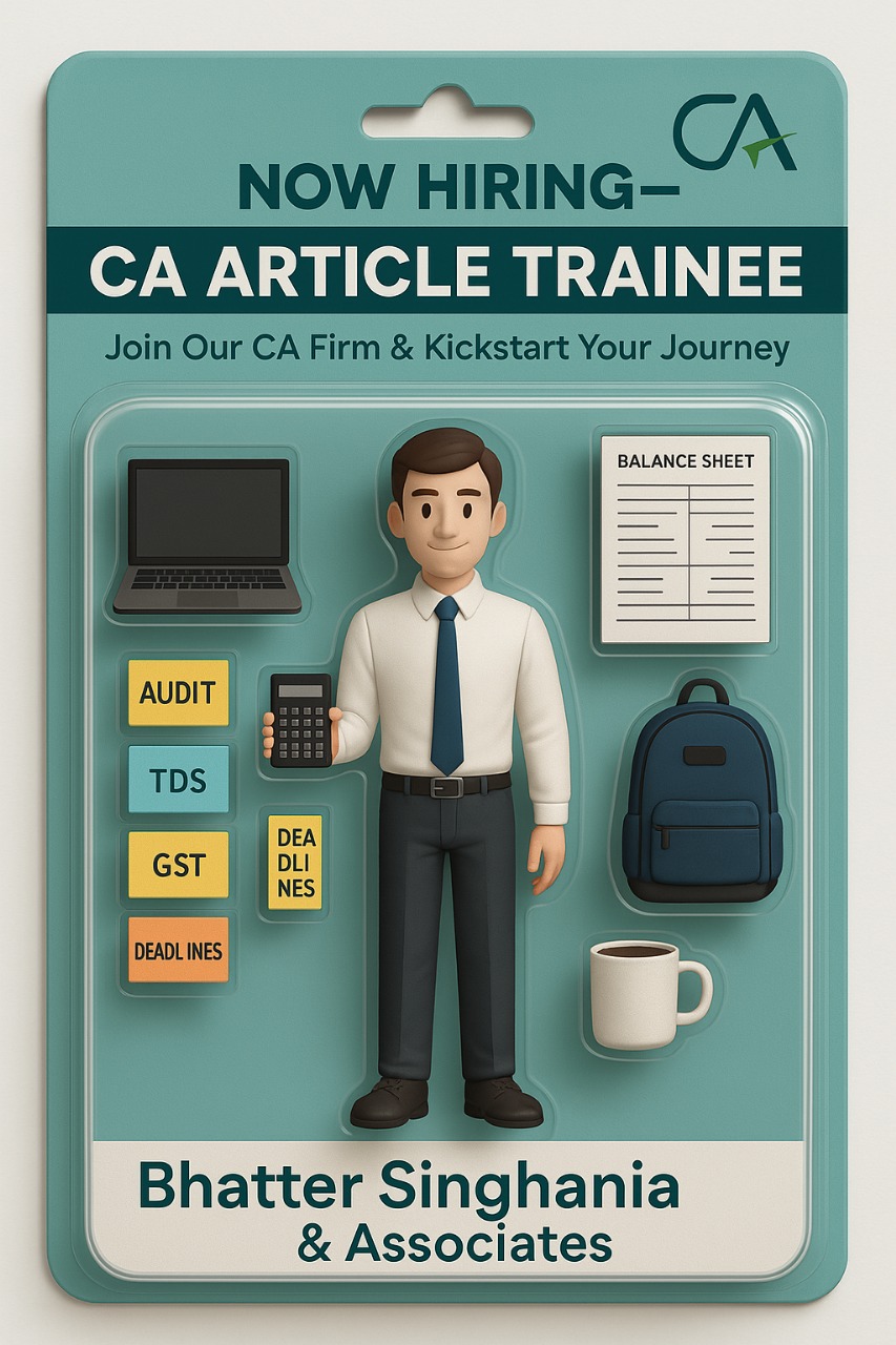Join Our Team as a CA Article Trainee at Bhatter Singhania & Associates Location:Kolkata About Us What You’ll Do What We’re Looking For This is an excellent opportunity to gain diverse exposure across taxation, audits, and corporate compliance while working in a dynamic professional environment[dot] If you're eager to learn and grow in the field of finance & taxation, apply now or reach out for more details! DM us or email your resume to himanshubhatter[at]yahoo[dot]com Office Location: 3RD Floor of the Premises No[dot] 02/759, Plot No[dot] 3001, Street No- 759, Action Area IID, near Water Tank No-11, P[dot]S- Eco Park, North 24 Parganas, W[dot]B[dot] 700161 ***Candidates looking for Paid up role are also welcome |